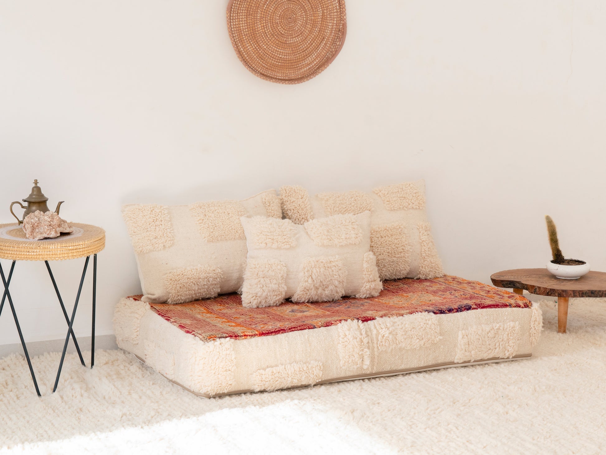 This Small Floor Couch is handmade using a Moroccan Rug. The covers are perfect to create a lovely Amazigh Moroccan corner in your house.