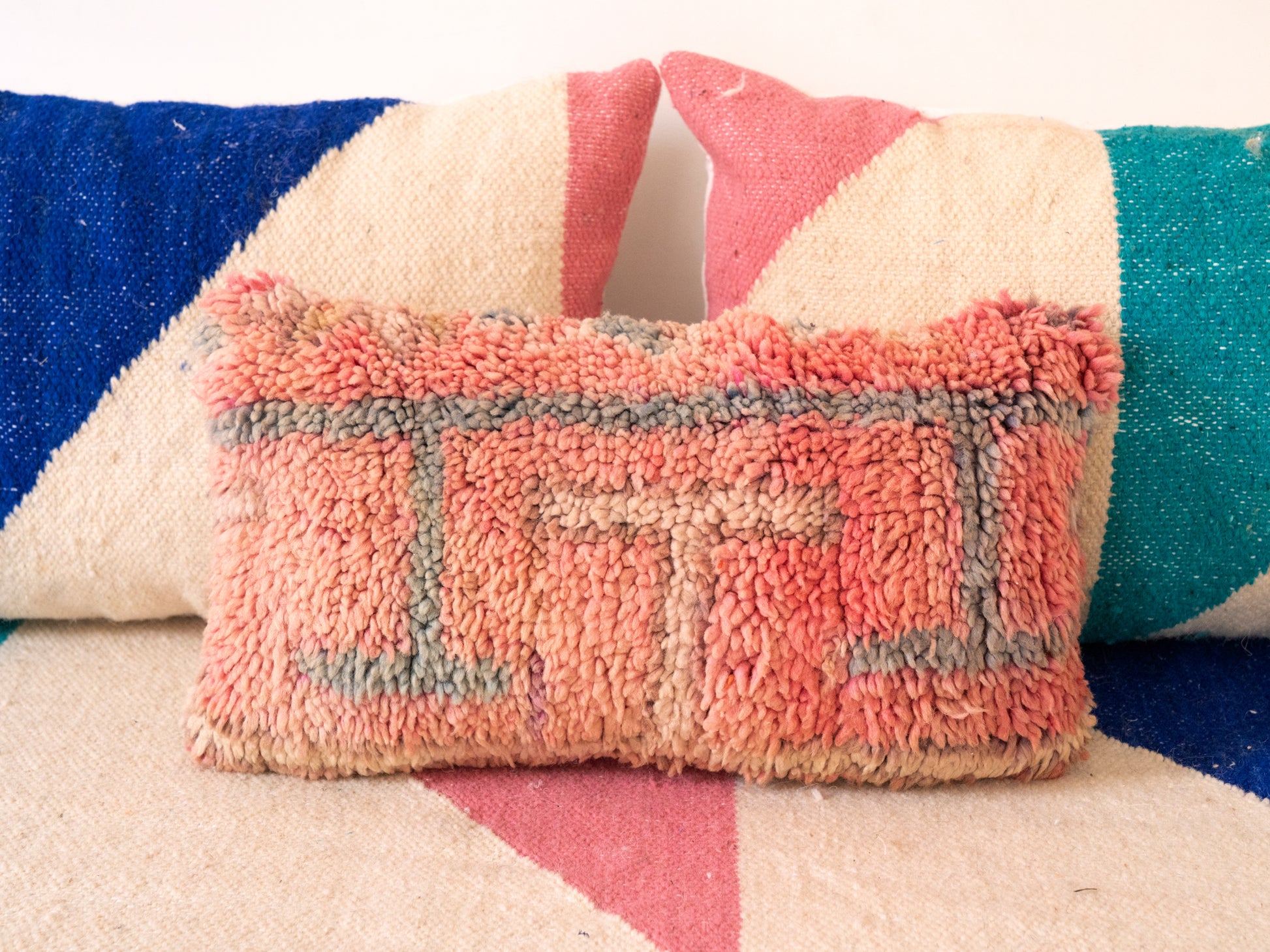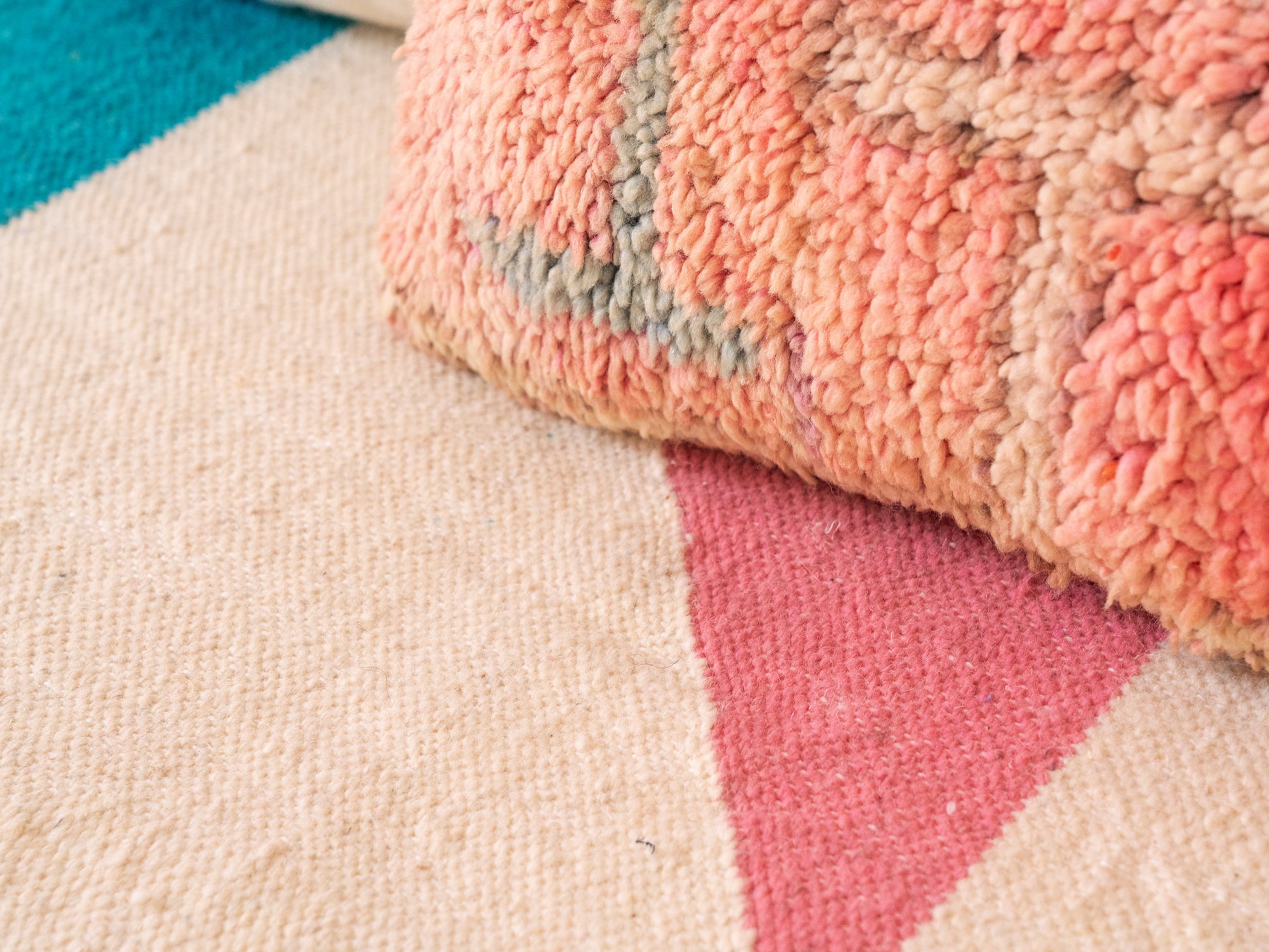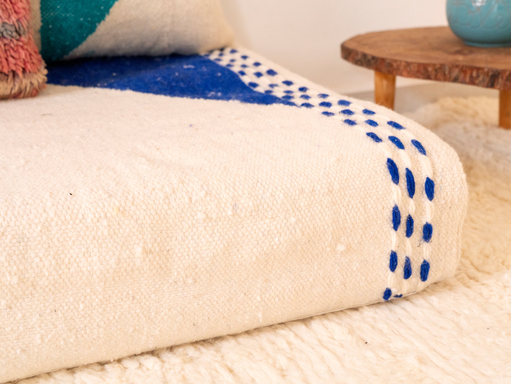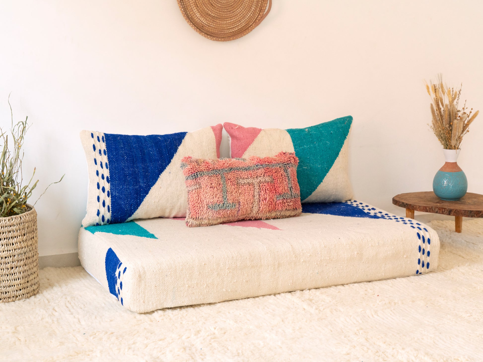 This Small Floor Couch is handmade using a Moroccan Rug. The covers are perfect to create a lovely Amazigh Moroccan corner in your house.