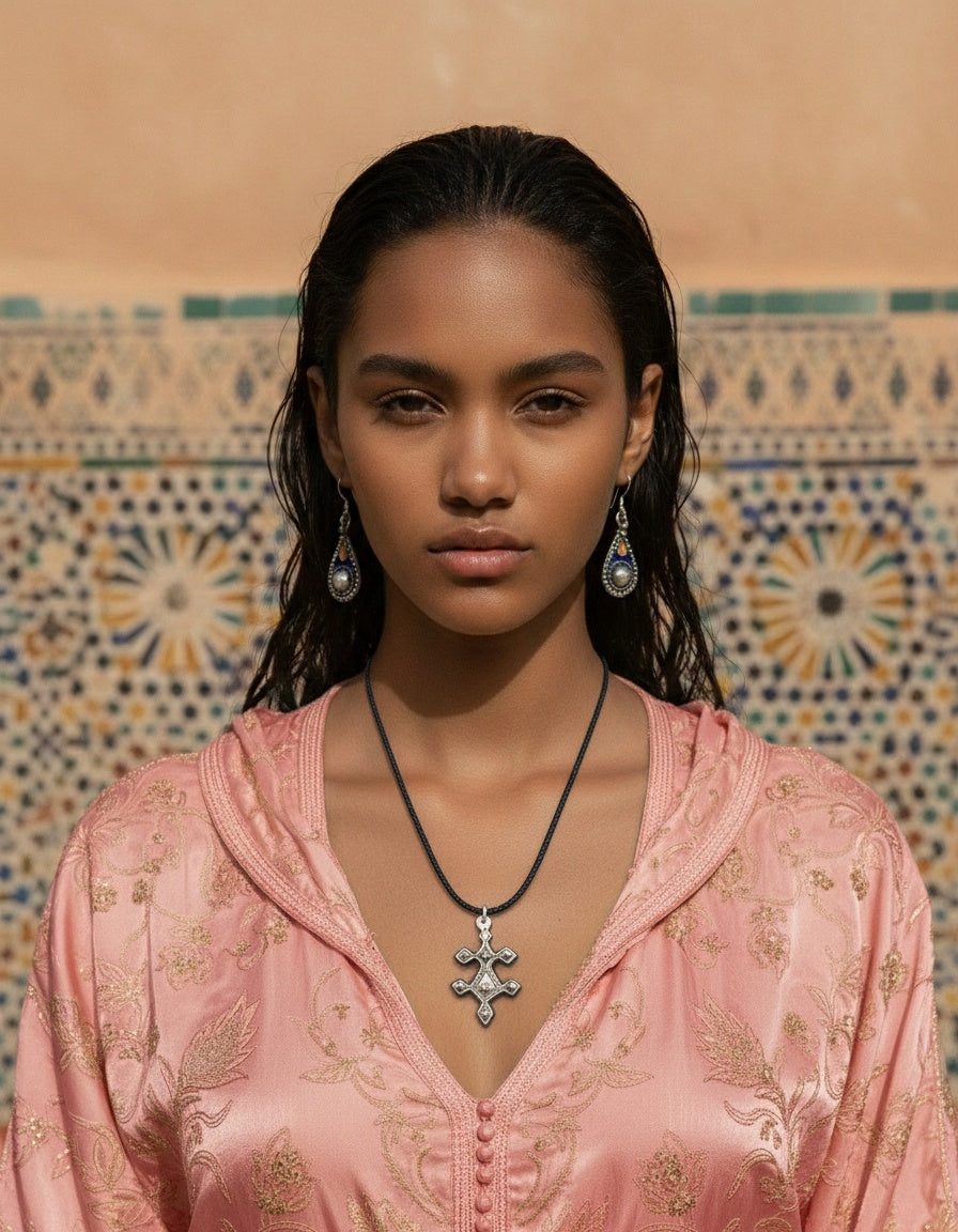 The Agadez cross or Tumast ⴾⴻⵢⵏⴰⵏ ⵏ ⴰⴳⴰⴷⴻⵣ in Tamazigh is the most popular category of Saharan Amazigh jewelry made especially by the Tuareg people. Only a few of this jewelry really looks like a cross. For most of them it’s a pendant with different silhouette, related either to a cross (tanaghilt) or to a shield (talhakim).