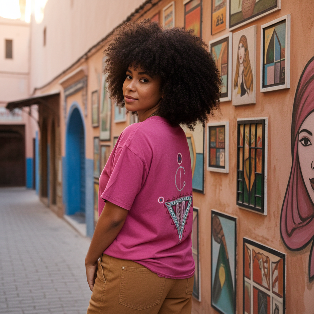A relaxed, loose-fit unisex tee featuring bold Amazigh-inspired prints. Made for comfort and style, it celebrates heritage while keeping your everyday look effortlessly cool.